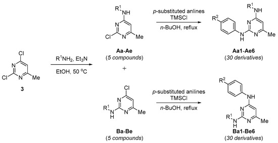 Nucleophilic aromatic substitution of commercially available 2,4-dichloro-6-methylpyrimidine (3) with five alkylamines resulted in ten mono-substituted compounds (Aa–Ae and Ba–Be, respectively), in an approximately 1:2 mixture of C2- and C4-substituted regioisomers favoring C4-substitution. We did not further optimize the ratio of this reaction because the initial hit compounds 1 and 2 were differently substituted at the C2 and C4 positions, respectively. Next, both A- and B-type regioisomeric intermediates were converted to 2,4-disubstituted pyrimidine products (Aa1–Ae6 and Ba1–Be6), respectively, with six p-substituted anilines through a second nucleophilic aromatic substitution reaction. Aniline coupling reaction of mono-substituted pyrimidine intermediates in the presence of trimethylsilyl chloride (TMSCl) in n-BuOH afforded the sixty disubstituted pyrimidine products in reasonable yields (Scheme 1). The structures of synthesized compounds from Aa1–Be6 are depicted in Table 1.