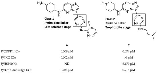 Imidazopyridazines are generally potent PfCDPK1 inhibitors, with some compounds demonstrating low micromolar to submicromolar activity against recombinant PfCDPK1 and P. falciparum erythrocytic parasites [23,38,39,40,41,42]. However, discrepancies between the enzymatic and whole-cell activities are generally reported for these compounds, which may be due to off-target activity or permeability issues [38,39]. Considerable effort was made to improve the selectivity and ADME (absorption, distribution, metabolism, excretion) profiles of imidazopyridazines, which resulted in compounds with well-balanced PfCDPK1 potency, permeability and in vitro activity against P. falciparum erythrocytic stage parasites [40,41,42]. Despite these efforts, studies still reported only modest in vivo activity in a P. berghei mouse model [39,40,41]. Further exploration of the mechanism of action of imidazopyridazines demonstrated that these compounds could be grouped into two classes based on the type of aromatic linker between the core and the R2 substituent (Figure 2) [23]. Class 1 compounds (6) had a pyrimidine linker and inhibited P. falciparum parasite growth at the late schizont stage, while class 2 compounds (7) had a non-pyrimidine linker and inhibited the trophozoite stage of P. falciparum. Two additional parasitic targets were also identified for imidazopyridazines: class 1 compounds inhibited PfPKG and class 2 compounds inhibited PfHSP90 (a chaperone protein of P. falciparum). These results suggest that the activity of imidazopyridazines against erythrocytic P. falciparum parasites is primarily due to inhibition of PfPKG and PfHSP90, rather than PfCDPK1 inhibition.