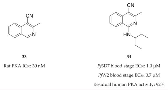 Drug discovery efforts targeting PfPKA and PfPKB are limited. Buskes and co-workers [83] attempted to develop PfPKA inhibitors using the commercially available PKA inhibitor 3-methylisoquinoline-4-carbonitrile (33, Figure 14) as a starting point. They studied the interactions of compound 33 and a series of substituted isoquinolines (e.g., 34, Figure 14) with a PfPKA homology model. In vitro evaluation of this series demonstrated low micromolar activity against drug-sensitive (3D7) and -resistant (W2) P. falciparum strains. However, biochemical evaluation of this series showed minimal activity against PKA [84]. It was suggested that these compounds likely inhibit another kinase that is involved in parasitic cytokinesis and erythrocyte invasion [84].