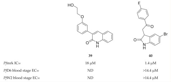 A series of quinolinones (e.g., compound 39, Figure 17) demonstrated Pfmrk activity with IC50 values ranging from 18 to 539 µM [105]. Neither antimalarial evaluation against whole-cell parasites nor molecular docking has been performed for this chemical class. Based on the structure of commercially available indirubin-3′-monoxime, a moderate inhibitor of Pfmrk and in vitro P. falciparum parasite growth, oxindole-based compounds were explored as inhibitors of Pfmrk [106]. Several oxindoles selectively inhibited Pfmrk in the low micromolar range, with the most potent being compound 40 (Figure 17). None of the oxindoles demonstrated any significant in vitro activity against whole-cell parasites. Homology modelling showed that these compounds had the same orientation in the active site of Pfmrk as in human CDK2, but with additional contact points which might be responsible for the Pfmrk specificity.