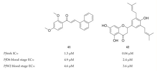 The chalcone and sulfonamide-based scaffolds were identified by means of a three-dimensional structure-activity relationship (3D-QSAR) pharmacophore model [109,112]. Compound 41 (Figure 18) was the most active compound of a series of chalcones tested against Pfmrk (IC50: 1.3 µM) [107]. However, a weak correlation was observed between the Pfmrk activity and the in vitro activity against drug-sensitive (D6) and -resistant (W2) P. falciparum strains. As several mechanisms of action have been reported for the antimalarial activity of chalcones [113,114,115], Geyer and co-workers [107] proposed that Pfmrk inhibition might be an additional mechanism demonstrated by some chalcones. Several flavonoids isolated from Erythrina sp., were evaluated for activity against Pfmrk [108]. The most potent flavonoid, Abyssinone V (42), had an IC50 value of 0.038 µM. Despite potent Pfmrk activity, the flavonoids demonstrated similar in vitro antimalarial activity to that of the chalcones, presumably due to the lower permeability of the flavonoids.