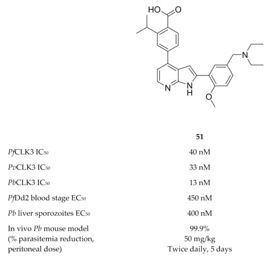 Isoquinoline sulfonamides were generally weak inhibitors of Pfmrk, except compound 43 (Figure 19) which demonstrated an IC50 value of 0.7 µM [111]. However, compound 43 failed to inhibit drug-sensitive (D6) and -resistant (W2) P. falciparum parasite growth. Thiophene sulfonamides exemplified by 44 and 45 (Figure 19) were found to be potent inhibitors of Pfmrk with IC50 values in the submicromolar range [110]. However, all of these compounds, except compound 45, are also potent inhibitors of human CDK7. Thiophene sulfonamides demonstrated minimal cytotoxicity and moderate in vitro activity against a multidrug-resistant P. falciparum (W2) strain.