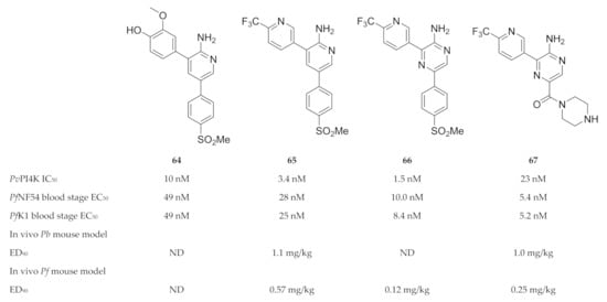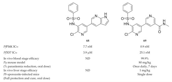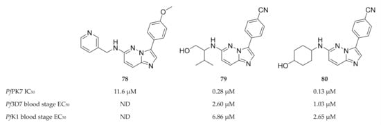 A screening campaign by Mahmood and co-workers [82] identified isoxazole-based inhibitors with PfPKG activity and selectivity over human PKG. Optimisation of this scaffold led to compounds 30–32 (Figure 13) with IC50 values <20 nM against PfPKG. Further evaluation of the physicochemical properties and in vitro activity of these compounds against the whole-cell parasite has not yet been reported.