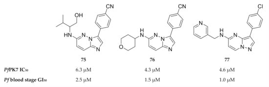 Based on pyrazolopyrimidine BKIs designed for Toxoplasma gondii CDPK1 (TgCDPK1) and Cryptosporidium parvum CDPK1 (CpCDPK1), a series of pyrazolopyrimidine derivatives (e.g., compounds 13–15, Figure 5) with potent activity against PfCDPK4 were designed [49,50].