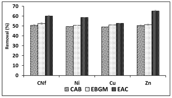 In order to obtain the best adsorption conditions for all pollutants studied different adsorbents were employed consisting of CAB (calcium alginate hydrogel), EBGM (calcium alginate hydrogel containing biodegraded grape marc) or EAC (calcium alginate hydrogel containing activated carbon), at different ratios between bioadsorbent/raw wastewater. In Figure 1 are shown the percentages of removal obtained for all pollutants using the three bioadsorbents tested (CAB, EBGM and EAC), using always a ratio 1:1 (v/v). As can be observed, the removal efficiencies obtained with CAB and EBGM were very similar for all pollutants with values ranged from 49.0–50.6 and 50.7–52.6%, respectively. In fact, the results obtained using both CAB and EBGM were statistically comparable (t-test) for each pollutant and the calculated tvalue and tcritical are shown in Table 2, where is observed that for CNf and Zn were not found significant differences (p = 0.05) between the results obtained using the two compared bioadsorbents; in contrast, for Ni and Cu the tvalue is always higher than tcritical for both 95 and 99% of probability and, consequently, the results compared were significantly different. It means that EBGM provides slightly higher removal efficiencies for these two elements, with differences of only 1.3% for Ni and 2.1% for Cu.