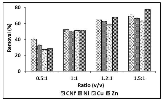 Although in order to enhance these adsorption capacities, different ratios were studied from 0.5:1 to 1.5: 1 (v/v) and the results are shown in Figure 2, observing that the adsorption capacity of all pollutants was considerably enhanced when the amount of bioadsorbent was increased, reaching the highest percentages of removal with ratios 1.5:1 (v/v). Thus, under these conditions Cu, Ni and CNf were removed from 63.2 to 69.5% and this value was increased until 77.6% for Zn. The corresponding adsorption capacities were 1177, 107.3, 39.5 and 1.52 mg/g for CNf, Ni, Cu and Zn, respectively.
