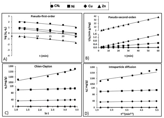 The kinetic study involves specific experiments in order to evaluate the effect of adsorption time in the capacity of all the pollutants studied. The kinetic experiments were developed using the procedure described in Section 3.3, although using only CAB as bioadsorbent with a ratio bioadsorbent/raw wastewater 1.5:1 (v/v). Kinetic experiments were carried out during 3–60 min and, at different intervals of time, samples of electroplating wastewater were obtained in order to evaluate the adsorption capacity of CAB. It is important to remark that individual experiments were developed for each stablished time, in order to avoid the effect of volume variation on the capacity of the bioadsorbent. These models include the pseudo-first-order [39] and pseudo-second-order [40]; as well as the Chien-Clayton model proposed by Chien and Clayton [41] and the intraparticle diffusion model proposed by Weber and Morris [42].