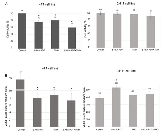 4T1 and 2H11 cells were seeded on 6-well plates in 2 × 106 cells/well density and treated as described in the experiment protocol. After 5-ALA-PDT treatment, cells were incubated for 48 h in culture media without FBS supplementation with TDM applied to samples. Following incubation cell culture media were collected and centrifuged. The supernatant was harvested, condensed twice, and subjected to tests with ELISA Mouse VEGF ELISA Kit (ab100751, Abcam) according to manufacturer’s instruction. After incubation, wells were washed, and horseradish peroxidase (HRP)-conjugated streptavidin was pipetted to the wells. The wells were washed again, and TMB substrate solution was added to the wells for color development. The Stop Solution changes the color from blue to yellow, and the intensity of the color was measured at 450 nm. The bars in Figure 1B present means from two independent experiments with standard deviation.