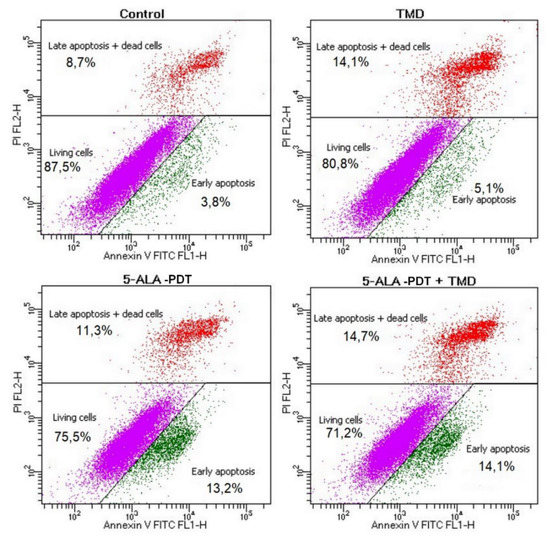In order to assess the apoptotic and necrotic 4T1 cells after the proposed treatment flow cytometry analysis using Annexin-5 and propidium iodide was performed. We observed an increase of early and late apoptosis after the combination of 5-ALA-PDT with TDM (almost 30% of cells) treatment in our mouse breast cancer model as compared to control cells. Cells treated only with 5-ALA-PDT or TMD alone underwent programmed cell death in 25% and 20%, respectively. The percentage of living cells, early apoptotic, and late apoptotic with dead cells results are presented in Figure 2.
