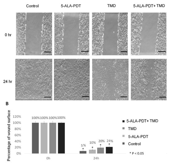 Because of the very high proliferative capabilities of 2H11 cell lines, we investigated the proposed treatment on migration capabilities by wound healing assay. Our results confirm a slight decrease in motility. Control cells and 5-ALA-PDT nearly filled the wound (5% remaining) by 24 h, whereas the wound in TMD- and PDT-treated cells remained unfilled in 30% in comparison to time 0 h. This result might be supported by the impaired expression of VEGF [23], but it needs to be confirmed on another group, where the recombinant murine VEGF should be used to reverse the observed phenotype.
