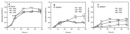 In order to measure the sugar availability by Bifidobacterium sp., 1% GOS, FOS, or MOS were added to the modified peptone yeast extract fructose (PYF) medium without a carbon source. B. bifidum KCTC 3357, B. longum SJ 32, and B. breve ATCC 15,700 were inoculated in the sterilized medium and incubated in an anaerobic condition at 37 °C, and the samples were collected at intervals of 12 h. The absorbance of the collected samples was measured at 600 nm to evaluate the degree of bacterial growth.