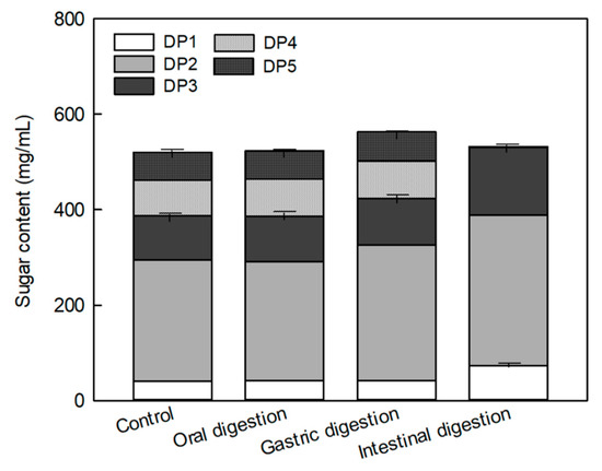 The digestibility of MOS was determined using an in vitro digestion model. The change in the MOS constituent sugar was measured after treating each group with enzymes that digest carbohydrates in the mouth, stomach, and small intestine (Figure 2). No significant difference was observed in the total MOS (maltotriose (DP3) + maltotetraose (DP4) + maltopentaose (DP5)) content between before (control: MOS without the enzyme treatment) and after in vitro salivary and gastric digestions (Figure 2). Moreover, no significant increase was observed in the glucose and maltose contents, which were the decomposed products of MOS, after salivary and gastric enzyme treatments. However, the contents of glucose (DP1) and DP3 were significantly increased after the pancreatic enzyme treatment, whereas the contents of DP4 and DP5 significantly decreased from 78.78 and 60.67 mg/mL before the pancreatic enzyme treatment to 1.16 and 0.42 mg/mL after the treatment, respectively. The decrease in the DP4 and DP5 contents was found to increase the contents of DP1, maltose (DP2), and DP3. As DP4 and DP5 were degraded by small intestinal enzymes, the amount of total MOS was also decreased.