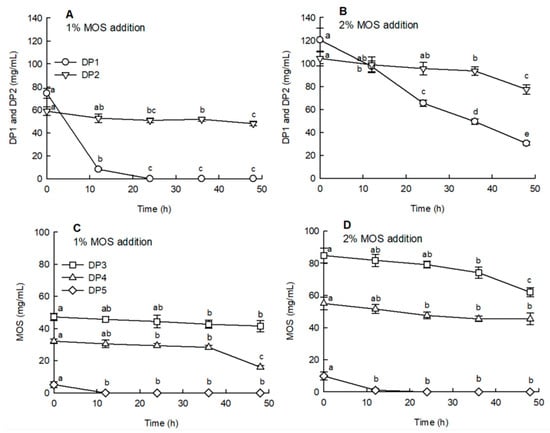 Figure 3 illustrates the changes in the sugar content of MOS during anaerobic fermentation. When 1% and 2% MOS were added, the glucose (DP1) content tended to decrease rapidly with the increasing fermentation time (Figure 3A,B). DP5 was also decomposed and decreased when fermentation commenced (Figure 3C,D: p < 0.05). The DP2, DP3, and DP4 contents tended to decrease relatively slowly compared to those of DP1. However, in the case of DP4, the decrease was higher after 36 h of fermentation than before this time period (Figure 3C: p < 0.05). This indicated that DP2–DP4 gradually decreased as sugars with a high polymerization degree were converted to a low polymerization degree by the fermentation strains.