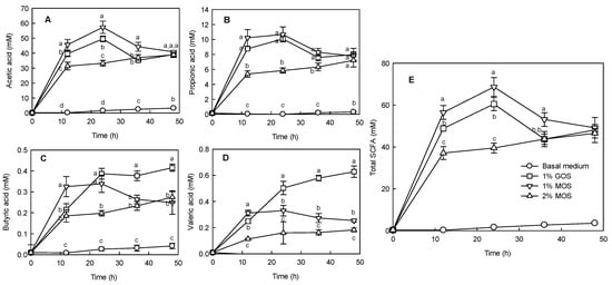 Changes in acetic acid (A), propionic acid (B), butyric acid (C), valeric acid (D), and total short chain fatty acid (SCFA, (E)) content during in vitro fermentation after the glucose and malto-oligosaccharide (MOS) addition. In vitro fermentation was carried out at 37 °C by inoculating feces under anaerobic conditions. Anaerobic fermentation was performed by adding 1% galacto-oligosaccharide (GOS), 1% MOS, and 2% MOS to the basal medium. Data are expressed as the mean ± standard deviation, and different letters indicate significant differences at p < 0.05 between groups at the same fermentation time.