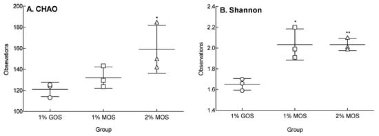 Alpha diversity of the three groups, 1% GOS, 1% MOS, and 2% MOS. The species richness (A) and species diversity (B) were evaluated by CHAO and Shannon indexes. The 1% GOS: Group fermented with fecal microbes by adding 1% galacto-oligosaccharide (GOS) to the basal medium; 1% MOS: Group fermented with fecal microbes by adding 1% malto-oligosaccharide (MOS) to the basal medium; 2% MOS: Group fermented with fecal microbes by adding 2% MOS to the basal medium. Data are expressed as the mean ± standard deviation, and different symbols indicate significant differences at * p < 0.05 and ** p < 0.01 vs. the GOS group.