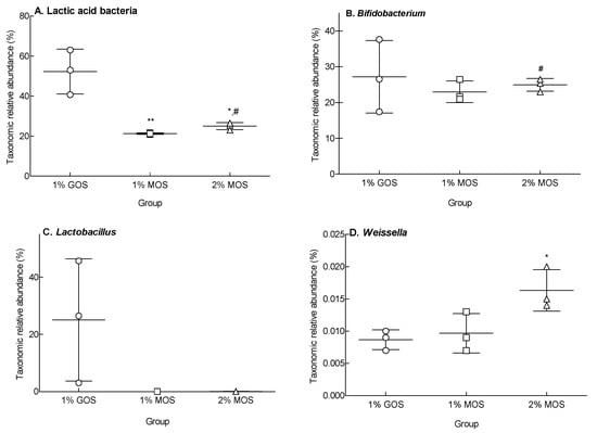 Relative abundance of lactic acid bacteria (A), Bifidobacterium (B), Lactobacillus (C), and Weissella (D) at the genus level. The 1% GOS: Group fermented with fecal microbes by adding 1% galacto-oligosaccharide (GOS) to the basal medium; 1% MOS: Group fermented with fecal microbes by adding 1% malto-oligosaccharide (MOS) to the basal medium; 2% MOS: Group fermented with fecal microbes by adding 2% MOS to the basal medium. Data are expressed as the mean ± standard deviation, and different symbols indicate significant differences at * p < 0.05 and ** p < 0.01 vs. the GOS group and # p < 0.05 vs. the MOS-1 group.