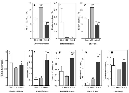 Relative abundance of Enterobacteriaceae (A), Enterococcaceae (B), total pathobiont strains (C), Bifidobacteriaceae (D), Lachnospiraceae (E), Ruminococcaceae (F), Bacteroidales (G), and total commensal strains (H) in the intestine at order and family levels. The total pathobiont strains are the sum of Enterobacteriaceae and Enterococcaceae, and the total commensal strains are the sum of Bifidobacteriaceae, Lachnospiraceae, Ruminococcaceae, and Bacteroidales. The 1% GOS: Group fermented with fecal microbes by adding 1% galacto-oligosaccharide (GOS) to the basal medium; 1% MOS: Group fermented with fecal microbes by adding 1% malto-oligosaccharide (MOS) to the basal medium; 2% MOS: Group fermented with fecal microbes by adding 2% MOS to the basal medium. Data are expressed as the mean ± standard deviation, and different symbols indicate significant differences at * p < 0.05, ** p < 0.01 and *** p < 0.001 vs. the GOS group and # p < 0.05, ## p < 0.01, and ### p < 0.001 vs. the MOS-1 group.
