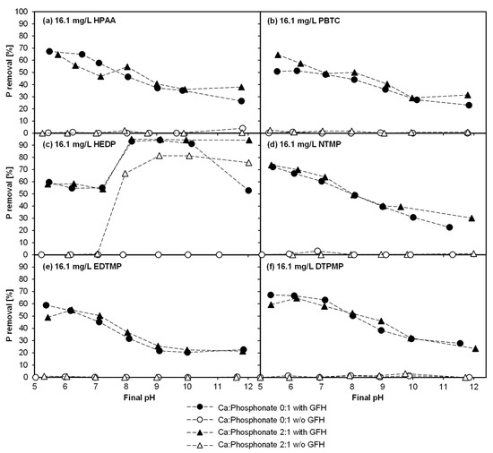 A closer look at the behavior of HEDP reveals two particularly noteworthy aspects. First, with a molar Ca:phosphonate ratio of 2:1, phosphorus was removed even in the absence of GFH, and second, in the presence of GFH, phosphorus was removed without the addition of CaII. In the latter case, about 67% of the phosphorus was removed at pH 8.0, about 81% at pH 9.1 and 10.1, and about 76% at pH 12.0. The removal of phosphorus even without the dosing of GFH suggests precipitation of CaCO3 or Ca-HEDP complexes. According to calculations performed with PHREEQC, at a calcium concentration of 156.2 µmol/L, more than 7.2 mmol/L of (hydrogen-)carbonate would be necessary to precipitate CaCO3 at pH 8.0. These calculations do not consider HEDP, which complexes at least parts of the CaII and additionally inhibits precipitation of CaCO3 [12,28]. Since deionized water was used in the experiments, and the samples were rotated in closed centrifuge tubes (closed system), the (hydrogen-)carbonate content (from airborne CO2) of the solutions is expected to be low. Therefore, the formation of CaCO3 is unlikely.