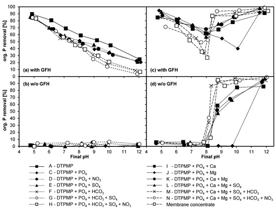 As shown in Figure 4c and Figure 5c, a noticeable change was observed with the addition of cations, indicating a possible synergistic interaction. The distinct tendency towards a drastically enhanced adsorption at pH values > 8 even resulted in an elimination increase of up to > 60 percentage points (e.g., at pH 12, from ~30% (solution C) to > 90% in the presence of CaII (solutions I to N)). However, at pH values > 8, a removal was also observable without GFH (Figure 4d and Figure 5d). Thus, precipitation must have occurred in some form at pH > 8.