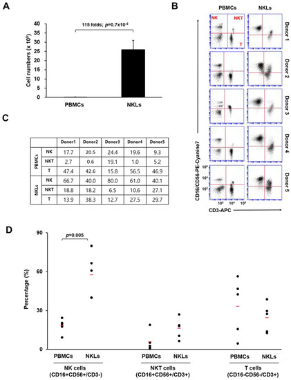 Characterization of expanded natural killer (NK)-cell-enriched lymphocytes (NKLs). (A) Comparison of total cell numbers. (B) Distribution of NK (CD3−CD16+CD56+), NKT (CD3+CD16+CD56+), and T cells (CD3+CD16−CD56−) compared between peripheral blood mononuclear cells (PBMCs) and NKLs from 5 individuals. (C) Percentages of NK, NKT, and T cells before and after the in vitro expansion. (D) The mean percentage of each group is indicated with red bars. Significant differences between PBMCs and NKLs were determined via analysis of variance (ANOVA).
