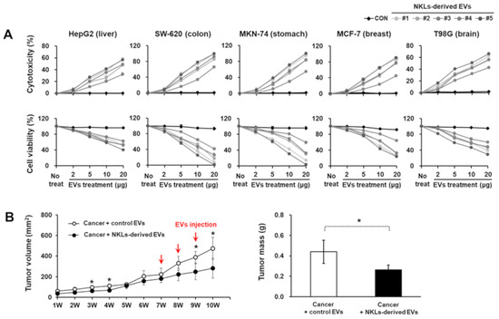 Cytotoxic potential of isolated EVs against cancer cell lines and cancer animal model. (A) Isolated individual EVs were used to treat 5 cancer cell lines from different tissues; cytotoxicity of isolated EVs against cancer cells was observed, and cell viability of cancer cells against isolated EVs was measured. Experiments were performed in triplicate. Significant differences between untreated cancer cells and EV-treated cancer cells were determined via ANOVA. (B) The volume of tumor and tumor mass after administration of vehicle (PBS) and NKL-derived EVs in MCF-7-cell-injected female athymic nude mice. The tumor volume was monitored every week for 10 weeks (n = 4 for each group), and tumor mass was measured at the end of the animal study. Significant differences between groups were determined via ANOVA, with p-values indicated as * p < 0.05.
