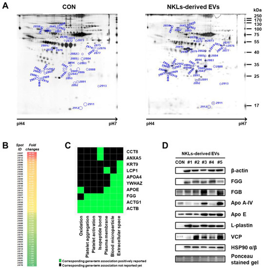 Proteome analysis of NKL-derived EVs. (A) Representative silver-stained two-dimensional electrophoresis (2-DE) gel images of control EVs (CON) and NKL-derived EVs (B) Spots with increased intensity and their fold changes in NKL-derived EVs compared to CON. A high-resolution image along with 2-DE gel images is presented in Figure S1. (C) Gene-Term 2D Heat map view using DAVID Bioinformatics resources. (D) The expression of increased proteins was confirmed by immunoblot analysis. 2-DE experiments were performed in triplicate per individual.