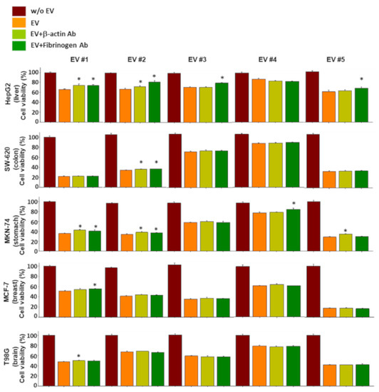 Effect of neutralizing antibodies against β-actin and fibrinogen on the anticancer effect of EVs. Individual EVs mixed with/without neutralizing antibodies specific to β-actin and fibrinogen were applied to 5 different types of cancer cells, and viability of cancer cells was measured. Experiments were performed in triplicate. Significant differences were determined via ANOVA, with p-values indicated as * p < 0.05 compared to the EVs without neutralizing antibodies.