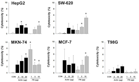 Cytotoxic effect of recombinant β-actin and fibrinogen on different types of cancer cells. Varying concentrations of recombinant β-actin and fibrinogen were applied to 5 different types of cancer cells, and cytotoxicity on cancer cells was measured. Experiments were performed in triplicate. Significant differences were determined via ANOVA, with p-values indicated as * p < 0.05 compared to untreated control (CON). Actin: β-actin, FN: fibrinogen.