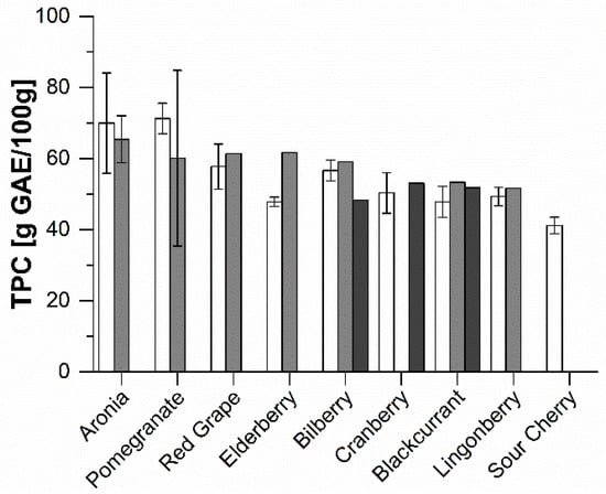 Total phenolic contents (TPC) of the extracts. Results are shown for extracts of direct juice (white), juice concentrate (light grey), and purees (dark grey), and are presented as means ± SD (n = 3). GAE = gallic acid equivalent.