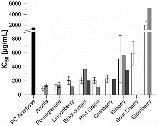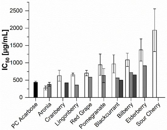 Inhibitory activities (IC50) of the red fruit product extracts against α-glucosidase. Results are shown for extracts of direct juice (white), juice concentrate (light grey), purees (dark grey), and the positive control (PC) acarbose. Bars represent means ± SD (n = 3)