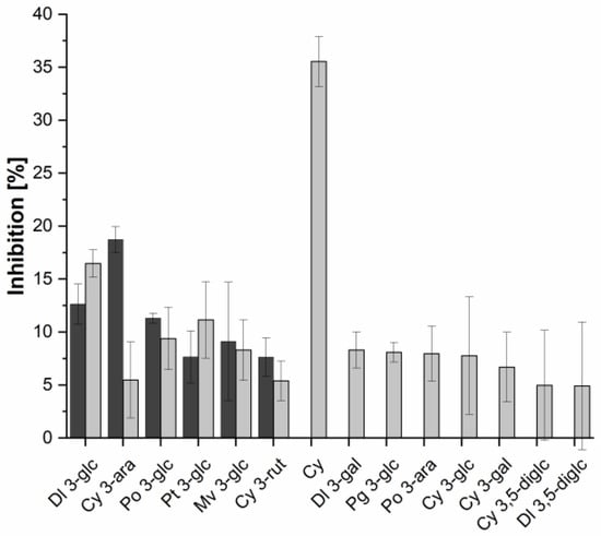 To identify the active ingredients in the extracts as well as to investigate possible synergistic effects, different commercially available standards from anthocyanins and copigments were examined. For all tested samples the IC50 value was higher than 2 mM. Therefore, the % inhibition of 2 mM of each single substance was compared as shown in Figure 4. In general, anthocyanins showed a higher inhibitory potential for α-glucosidase. Cyanidin exhibited with an inhibition of 35.5 ± 2.4% the highest potential for α-glucosidase inhibition. Among the cyanidin derivatives, cyanidin 3-glucoside with 7.8 ± 5.5% inhibition was the next active substance while cyanidin 3,5-diglucoside (inhibition = 4.9 ± 5.2%) was the less active compound. In the α-amylase study, cyanidin 3-arabinoside showed with an inhibition of 18.7 ± 1.2% the highest inhibitory potential followed by the glucosides of delphinidin, peonidin, malvidin, and petunidin (inhibition: 12.7 ± 1.9%; 11.3 ± 0.5%; 9.1 ± 5.6%; 7.7 ± 2.5%) as well as cyanidin 3-rutinoside with 7.6 ± 1.8% inhibition. For a total of eight substances no inhibition of α-amylase activity could be determined. By trend, glycosides (mainly glucosides) of other aglycons than cyanidin (delphinidin, peonidin, petunidin, and malvidin) showed higher inhibitory activities in both inhibition studies. Furthermore, substances with a smaller sugar group attached inhibited the digestive enzymes more effectively.