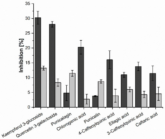 The results of the commercially available copigment standards tested in both assays are shown in Figure 5. The tested substances in concentrations of 2 mM each were generally more potent inhibitors of α-amylase than α-glucosidase except for punicalagin and punicalin. The most active copigment in both assays was kaempferol 3-glucoside (inhibition: 30.3 ± 2.2% for α-amylase; 13.2 ± 0.7% for α-glucosidase), followed by quercetin 3-galactoside with inhibition values of 28.0 ± 1.0% and 8.3 ± 1.2% for α-amylase and α-glucosidase, respectively. On the other side, caftaric acid was not a very potent inhibitor of the two digestive enzymes (11.5 ± 2.5% inhibition for α-amylase; 4.6 ± 2.2% inhibition for α-glucosidase). Ellagic acid, punicalin, and punicalagin, as well as chlorogenic acid, 3-caffeoylquinic acid and 4-caffeoylquinic acid showed comparable inhibitory activities in both assays, which could be due to their structural similarity. While punicalin (3.8 ± 0.2% inhibition) and punicalagin (4.8 ± 2.6% inhibition) as well as the two caffeoylquinic acids (inhibition: 4-caffeoylquinic acid: 16.0 ± 3.1%; 3-caffeoylquinic acid: 13.8 ± 1.4%) demonstrated a slightly lower inhibition of α-amylase activity than ellagic acid (11.0 ± 0.8% inhibition) and chlorogenic acid (20.3 ± 2.3% inhibition), a contrary observation could be made for α-glucosidase (inhibition: ellagic acid: 6.0 ± 0.8%; punicalin: 8.7 ± 0.6%; punicalagin: 11.5 ± 1.0%; chlorogenic acid: 1.6 ± 3.1%; 4-caffeoylquinic acid: 4.5 ± 3.3%; 3-caffeoylquinic acid: 3.6 ± 2.2%).