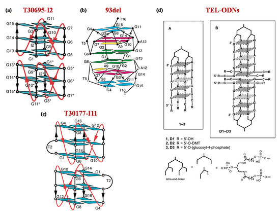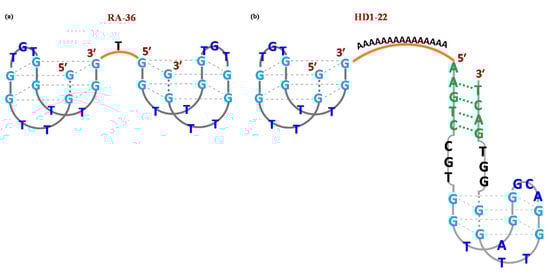In particular, TBA15 and TBA29 were linked exploiting different spacers, such as a 15-nt long poly(dA) linker providing HD1-22 (Figure 3b) [110,111] or poly(T) spacers of various length [112].
