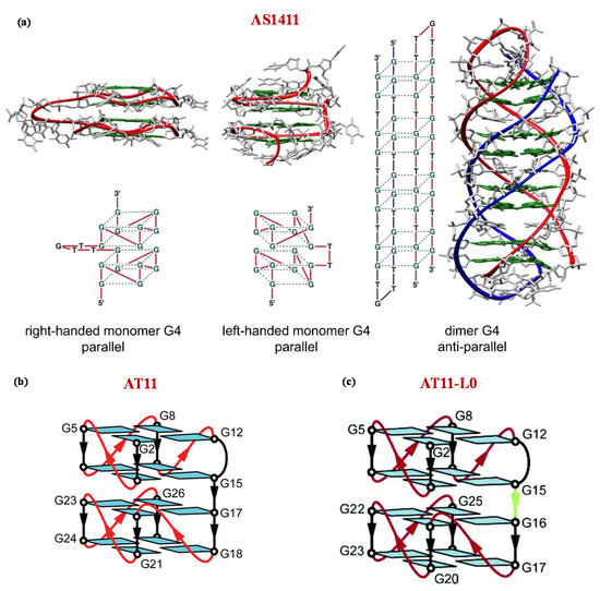 Schematic representation of the possible G-quadruplex structures of AS1411 (a) and NMR-derived G-quadruplex structures adopted by AT11 (b) and AT11-L0 (c) in K+-solutions as described by Dailey et al. [161], Do et al. [165], and Carvalho et al. [166] respectively. Figures were reproduced from refs [154,165,166] with permission.