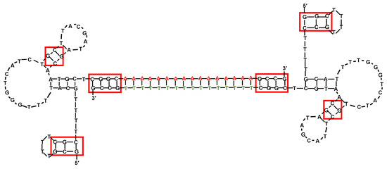 Schematic representation of the secondary structure of the monomeric and dimeric- vitronectin-targeting aptamers VBA-01 (a) and DVBA-01 (b) as predicted by the mfold software for nucleic acid folding prediction [64]. In DVBA-01 structure, red boxes indicate potential Dox-binding sites. Figures were redrawn from Stuart et al. [177].