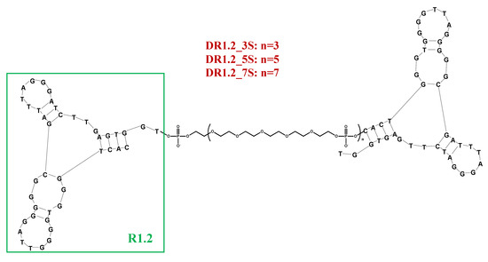 In a subsequent work, three different homodimeric R1.2 variants were designed analyzing the impact of the linker length on the binding affinity. As previously experienced with TD05, HEG-based spacers were used. In particular, 3, 5, or 7 repeated units were inserted to join two R1.2 motifs thus providing DR1.2_3S, DR1.2_5S or DR1.2_7S (Figure 8). In all cases, dimeric constructs exhibited improved binding affinity with respect to the monovalent R1.2 aptamer especially at physiological temperatures, while at 4 °C similar or slightly improved Kd values were found (Table 1) [191].