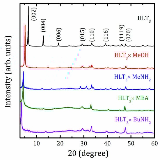 The organic-inorganic hybrids were prepared according to the method described in Section 3. Further, in the text, tables, and figures, the studied materials will be denoted as follows: the layered protonated perovskite, H2La2Ti3O10·xH2O-HLT3, the methylamine derivative, H2La2Ti3O10 × MeNH2-HLT3 × MeNH2, the n-butylamine derivative, H2La2Ti3O10 × BuNH2-HLT3 × BuNH2, the methanol derivative, H2La2Ti3O10 × MeOH-HLT3 × MeOH, and the monoethanolamine hybrid, H2La2Ti3O10 × MEA-HLT3 × MEA.
