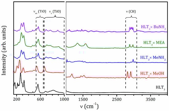Raman spectra of the initial protonated form and obtained hybrid compounds are shown in Figure 2. The fact of the formation of the hybrid is confirmed by the appearance of characteristic bands, which are not observed in the spectra of the precursor—stretching of C–H (2800–3000 cm−1) and N–H (3225 cm−1) bonds, as well as latitudinal vibrations of methyl (1480 cm−1), methylene (1460 cm−1), amino (1560–1580 cm−1), and C–O–H (1340 cm−1) fragments. In the low-frequency region (<350 cm−1), which contains complex vibrations of the interlayer components linked to the oxygen of TiO6 octahedra, the main changes are related to the symmetric stretching mode (νs) of the axial Ti–O bonds (810 cm−1 for the protonated form), which splits into two bands (765 and 895 cm−1) during amine intercalation, which points at the existence of two types of octahedra with unequal axial Ti–O distances. Bands of asymmetric stretching mode (νas) of the closest to the interlayer space TiO6 octahedra (500–600 cm−1) and vibrations of the central weakly distorted octahedra (470 and 685 cm−1) do not experience noticeable changes during hybrids formation, indicating the preservation of the perovskite structure [55,56].