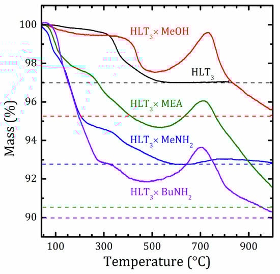 The degree of hydration and the temperatures corresponding to the loss of water and organic molecules were determined by thermogravimetric analysis with simultaneous mass spectrometric identification of the released gases (STA-MS). The thermal gravimetric (TG) curves are shown in Figure 3. The more detailed information on the STA-MS analysis can be found in Supplementary Materials Figures S7–S10. The thermal degradation of the methylamine hybrid HLT3 × MeNH2 in the oxidizing atmosphere proceeds as deintercalation. The evacuation of the intercalated water takes place at temperatures above 50 °C, followed by methylamine evacuation above 100 °C, giving the deintercalated protonated form, which decomposes at 300–500 °C. HLT3 × BuNH2 undergoes thermal degradation mainly in the same way as HLT3 × MeNH2. The only difference is observed at temperatures above 500 °C; in HLT3 × BuNH2, there is a noticeable mass gain stage, obviously associated with oxidation, which is replaced by the further mass loss stage related to the carbon dioxide release; see Supplementary Materials Figures S7 and S8. This suggests the existence of some remaining carbon-containing substances in the sample after the first stage of the decomposition. The same mass gain stages are also observed for the HLT3 × MeOH and HLT3 × MEA compounds.