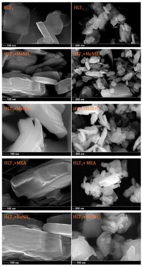 According to the scanning electron microscopy (SEM) data (Figure 4), during the intercalation and grafting reactions, both sizes and the lamellar forms of the particles are predominantly retained. Although the SEM images of the HLT3 × MeNH2 and HLT3 × BuNH2 organic-inorganic derivatives clearly confirm their incipient lamination, no other significant morphological changes are observed. Thus, all the reactions of the hybrid formation follow the topochemical mechanism: the structure of the inorganic part of the hybrids stays almost native and, consequently, saves all the useful properties of the initial perovskite-like compound, which may be combined with those of an organic part, giving new materials.