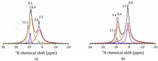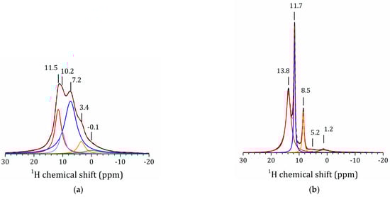 Figure 6a shows the 1H MAS NMR spectrum of the methanol derivative. The spectral lines are very broad, even at 14 kHz of spinning frequency. Consequently, both the rotational diffusion of the CH3 moieties and proton exchange are slow in this sample. The spectrum can be deconvoluted into three main peaks. The line at 3.4 ppm can be attributed to the CH3 moieties. The lines at 11 and 7 ppm can be attributed to the interlayer H+ in regular sites in water-poor and water-rich environments, respectively [50,62]. These results can be compared to the 1H MAS NMR spectrum of H2La2Ti3O10(H2O)0.07 (Figure 6b). In this sample, the lines corresponding to the water-poor (11.7 ppm) and water-rich (8.5 ppm) environments are narrow, which means that proton mobility in this environment is high. The line at 13.8 ppm can be attributed to the interlayer H+ in a water-free site. The mobility of these species is restricted, and the line is broad. Note that the modification of the inorganic matrix strongly affects the mobility and the distribution of the interlayer H+. The high-field signals in these spectra can belong to residual TiOH groups and surface-bound water [63,64,65].