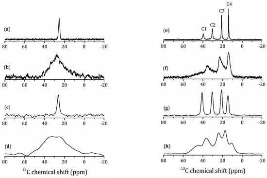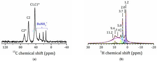 13C-NMR spectra of the methylamine and n-butylamine derivatives are shown in Figure 7. For HLT3 × MeNH2 in the 13C{1H} CP/MAS spectrum, only one line at 25.3 ppm is observed (see Figure 7a), which is in fair agreement with the position of the methyl carbon for the methylammonium cation.