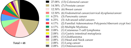 With respect to the type of cancer, a majority of the 48 studies focused on colorectal (n = 13) and prostate (n = 7) cancer, followed by breast (n = 6), uterine (endometrium and cervix, n = 6) and pancreatic cancer (n = 3) models (Figure 1).