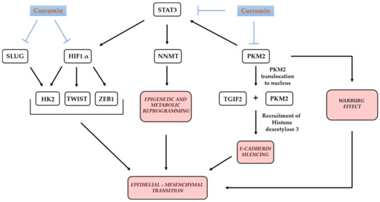 Pyruvate kinase isoform PKM2, which catalyzes the final step of glycolysis and promotes the Warburg effect, and is a positive regulator of STAT3 activity [142], has been shown to promote EMT. Nuclear translocation of PKM2 and its direct interaction with a transcriptional cofactor repressor TGF-β-induced factor homeobox 2 (TGIF2), causes recruitment of histone deacetylase 3 to E-cadherin promoter, leading to EMT through suppression of E-cadherin transcription [143]. Curcumin has been shown to downregulate the expression of PKM2 [144,145] and to influence its nuclear localization, albeit in a cell-type-specific manner [145]. In line with curcumin’s negative effect on PKM2 expression and nuclear localization, upregulation of E-cadherin upon curcumin treatment has been reported in various types of cancer cells [146,147,148,149]. Concomitant with reducing HIF1α expression, curcumin reduces the expression of EMT-inducing factors Twist Family bHLH Transcription Factor (TWIST) and Zinc Finger E-Box Binding Homeobox 1 (ZEB1) [150], since HIF1α-binds to hypoxia-response elements (HRE) in their promoters [151,152].