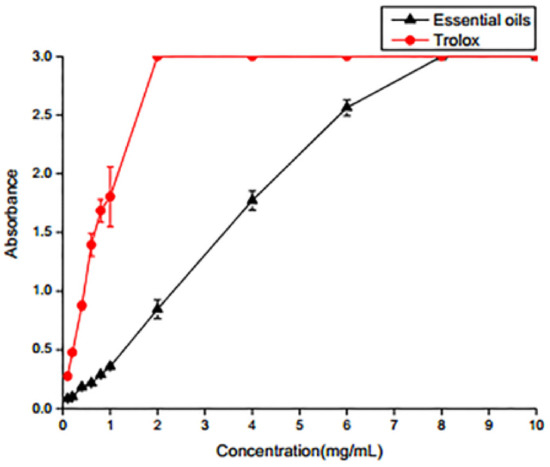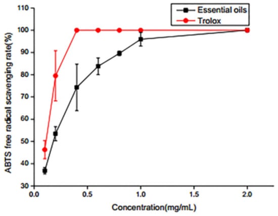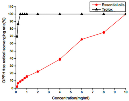 DPPH, as a stable free radical, has been widely used as a tool to evaluate free radical scavenging antioxidant activities. As shown in Figure 2, the DPPH free radical scavenging rate depended on the concentration of SEO. DPPH free radical scavenging rates were 15.90%, 22.40%, 39.01%, 65.94%, 75.25%, 92.57% and 100%, when the concentrations of SEO were 1, 2, 4, 6, 8, 9 and 10 mg/mL, respectively. It is significant that the DPPH free radical scavenging ability of SEO reached 100% when the concentration of SEO was 10 mg/mL, which is the same rate as that of the positive control trolox. The DPPH free radical scavenging activity results showed that SEO had good antioxidant activity. The antioxidant properties of terpenes and their derivatives were similar to those of phenolic compounds, which can scavenge free radicals by supplying hydrogen to hydrogen atoms [25]. It has been reported that α-pinene and α-celene react rapidly with peroxy radicals, resulting in rapid termination of the oxidative chain reaction and thereby reducing the number of reactive free radicals [26].