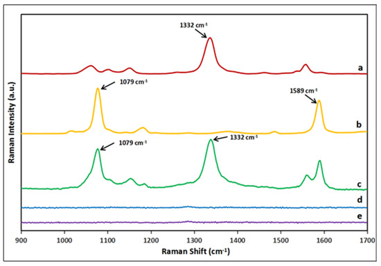 SERS nanoprobe was prepared by modifying Au@Ag NP with Raman labels and antibody/receptor. Firstly, a layer of DTNB or MBA molecules was placed on the Au@Ag NP via Au-S bond. Both DTNB and MBA have been utilized as Raman labels owing to their inherent capacity to generate a characteristic and intense SERS signal [10,12]. Figure 2 shows the characteristic peaks of DTNB mainly comprise 1059, 1332, and 1558 cm−1, while the typical peaks of MBA mainly comprise 1079 and 1589 cm−1, respectively. As the bands of 1332 cm−1 of DTNB and 1079 cm−1 of MBA are the most intense bands in their spectra, the SERS intensity of two bands was thus used for quantitative analysis. It can be observed that the two bands from DTNB and MBA have no significant overlap with each other, thus facilitating the simultaneous detection of two different antibiotic residues on a single test line by utilizing DTNA and MBA as Raman labels in the preparation of SERS nanoprobes. To further confirm the SERS enhancement effect originated from Au@Ag NPs, the Raman signal of both Au@Ag NP-DTNB/MBA complexes and free DTNB/MBA molecules was compared. As revealed in Figure 2, the Au@Ag NP-DTNB/MBA complexes produced an intensive Raman signal at 1332 cm−1 and 1079 cm−1, respectively. Nevertheless, free DTNB and MBA molecules at the same Raman reporter concentration did not produce any observable Raman signal. Furthermore, the Au@Ag NPs cannot yield any observable Raman signal (Figure 2a). Thus, it can be concluded that the Raman signals of DTNB and MBA were greatly enhanced by the Au@Ag NPs after the two Raman labels were attached onto the Au@Ag NP surface.