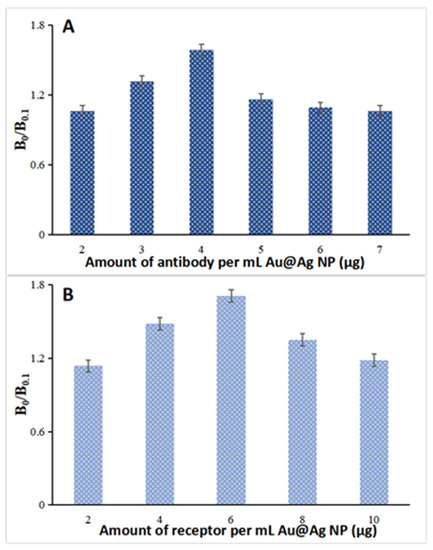 After attaching DTNB or MBA molecules onto the Au@Ag NP surface, the antibody/receptor could be passively adsorbed onto the nanoparticle surface via electrostatic and hydrophobic interaction [24]. The antibody/receptor amount used in the conjugation process is anticipated to affect the attached antibody/receptor number per Au@Ag NP. This is correlated to the SERS nanoprobe avidity and influences the assay sensitivity [24]. To optimize the antibody/receptor amount for SERS nanoprobe preparation, the ratio of SERS intensity at 0 and 0.1 ng/mL of tetracycline or penicillin (B0/B0.1) was compared for the prepared nanoprobes. Consequently, at a similar SERS signal, the optimized amounts of antibody/receptor that generate the most significant difference between 0 and 0.1 ng/mL of the antibiotics were measured to be 4.0 μg of anti-tetracycline antibody (Figure 3A) and 6.0 μg of anti-penicillin receptor (Figure 3B). Thus, these antibody/receptor amounts were chosen for preparing the SERS nanoprobes.