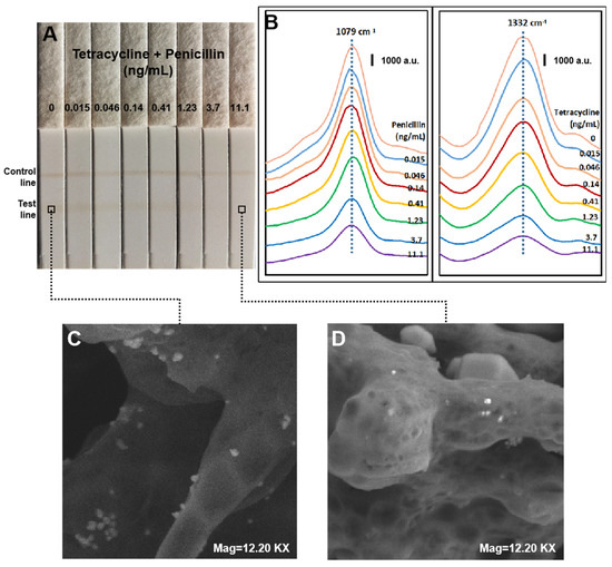 As tetracycline and penicillin are both small molecules, the SERS-based lateral flow immunosensor utilized a competitive assay format. In this format, free tetracycline/penicillin molecules and capture antigens compete for the limited antibody/receptor epitopes on the SERS nanoprobes. The analyte concentrations in samples can be determined through the Raman signal produced by the SERS nanoprobes captured on the test line of lateral flow strips (Figure 4). Figure 4A,B show typical photographic images obtained from the test strips and their corresponding SERS spectra are depicted. Increasing the concentration of tetracycline and penicillin decreased all the characteristic peaks of SERS spectra, which is typically observed for a competitive immunoassay. Moreover, as shown in the SEM images of the lateral flow strip, for the negative sample, many SERS nanoprobes were bound on the test line (Figure 4C), while for the positive sample, less SERS nanoprobes were observed to be attached onto the test line (Figure 4D). This further confirms that the characteristic Raman signals were produced by the SERS nanoprobes. The calibration curves as indicated in Figure 4B plot the Raman signal at 1332 cm−1 and 1079 cm−1, the most characteristics peaks of DTNB and MBA, against the logarithmic concentrations of tetracycline or penicillin. As evident from the figure, the SERS intensities demonstrate a linear regression with a logarithmic rise in analyte concentration and the linear ranges were in the range of 0.02–11 ng/mL for both tetracycline and penicillin in milk.