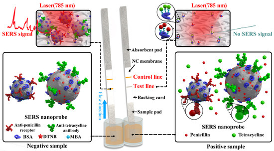 As indicated in Figure 5, the nitrocellulose membrane was immobilized with two capture antigens including tetracycline-BSA and ampicillin-BSA conjugates, while the micro-plate well contained two kinds of SERS nanoprobes including anti-tetracycline Au@Ag NP-DTNB-antibody conjugate and anti-penicillin Au@Ag NP-MBA-receptor conjugate. If the sample solution did not contain tetracycline, penicillin, and related analogs, the SERS nanoprobes could bind with the capture antigens on the test line to form a visible test line. Beneath the laser excitation, an intensive SERS signal (1332 cm−1 for tetracycline and 1079 cm−1 for penicillin) can be produced (Figure 5). Nevertheless, if the sample solution contained tetracycline or penicillin molecules, the antibiotics in the solution can first bind with the SERS nanoprobe in the micro-plate well, and less free SERS nanoprobes would react with the capture antigen on the nitrocellulose membrane, and hence less SERS nanoprobes would be captured by the coating antigen. Consequently, a far weaker SERS signal would be produced on the test line of the nitrocellulose membrane. If tetracycline and penicillin were in an excess amount, the detection reagents would be impeded from mixing with the capture reagents, and no corresponding SERS signal on the test line can be produced (Figure 5). If the SERS-based LFIA process was normal, a visible control line could be observed by the naked eye and intensive SERS signals can be produce under lasers’ excitation. For the quantitative determination of antibiotic residue, two calibration curves were constructed by plotting the ratios (B/B0) of SERS intensity between the spiked and blank samples against the logarithmic concentrations of corresponding antibiotics. The analyte concentration can be determined by the collected signal of an unknown sample based on the established calibration curve.