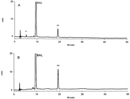 The sample of BAL was prepared in the same way described in our work regarding the influence of KMnO4 on the LOM [27]. An acetate buffer pH 4.5 was used in the study. After 15, 30, 45, and 60 min of incubation at RT, the tested samples were analyzed by HPLC.